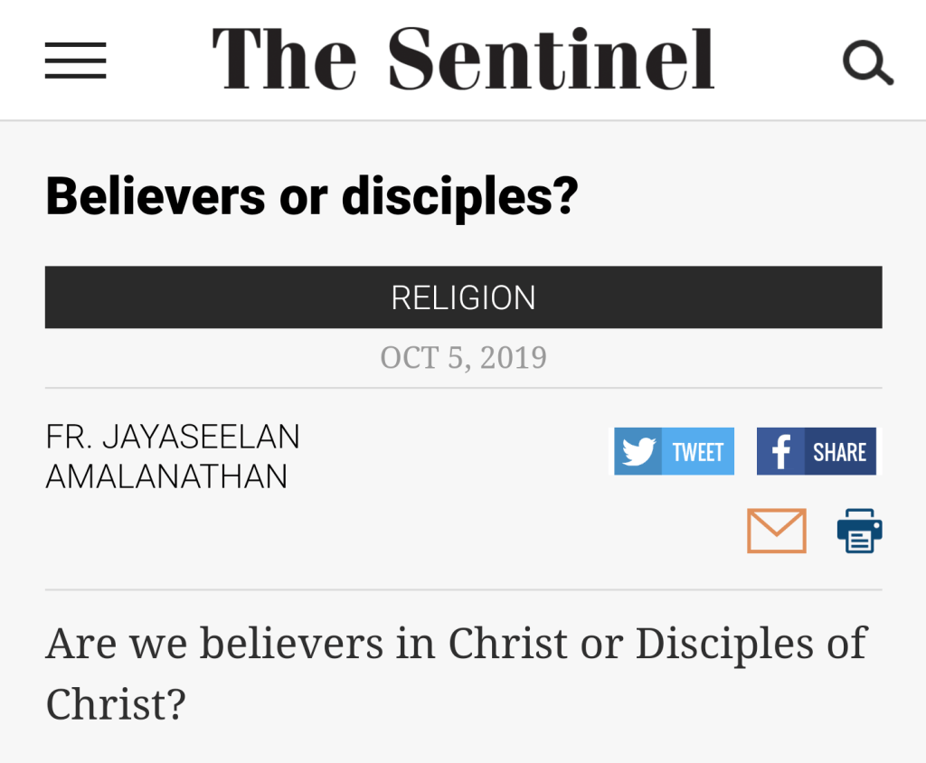 Amalanathan, J. (2019, October 5). Believers or disciples? lewistownsentinel.com. Retrieved October 16, 2021, from https://www.lewistownsentinel.com/news/religion/2019/10/believers-or-disciples/.