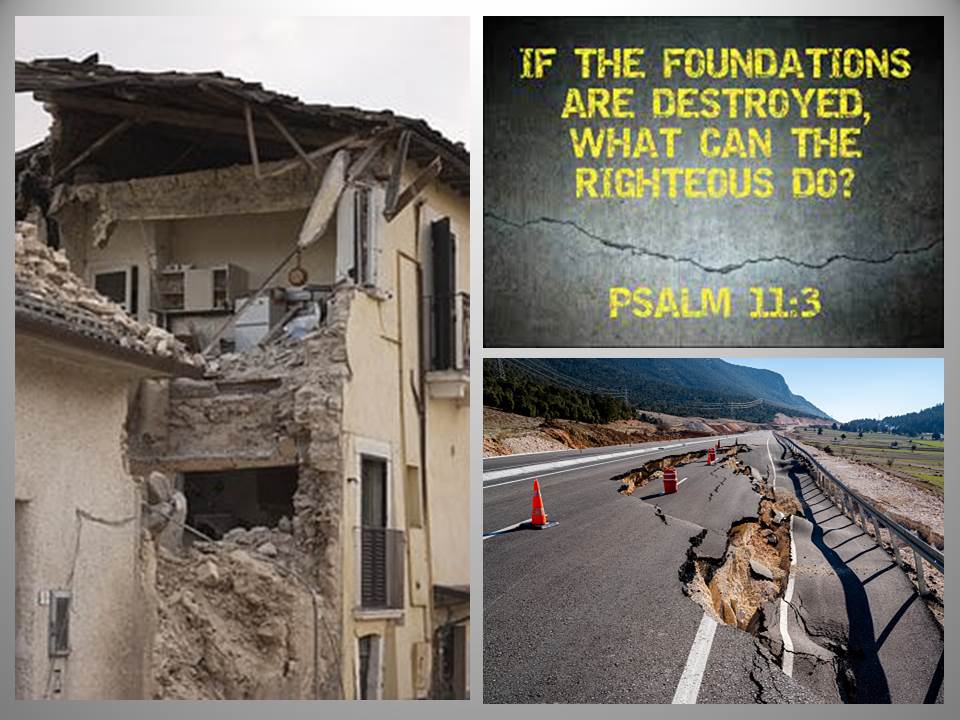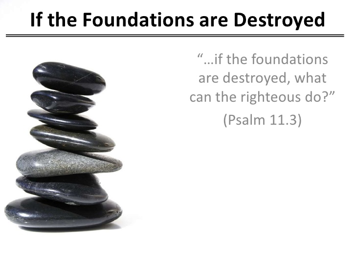 Foundations are destroyed and are continually being destroyed right under our noses. Nevertheless, I take comfort in the fact that King Jesus warns us ahead of time and prepares us. While the question is asked, what can be done when the foundations are destroyed; know that an answer is given too. In my journey to search for this answer I found myself considering closely all that Father had to say in his written Word about foundations for I firmly believe tht the answer to everyone question and concern that we may have can be answered by God’s Word. Here is a list of some of the verses that we will be considering in reference to answer the question raised in Psalm 11:3.