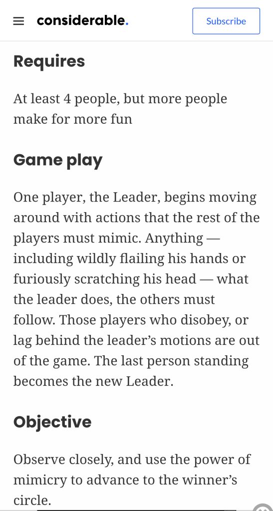 Teacher: The game we will play today is called Follow the Leader. Here are the instructions for how to play this game: