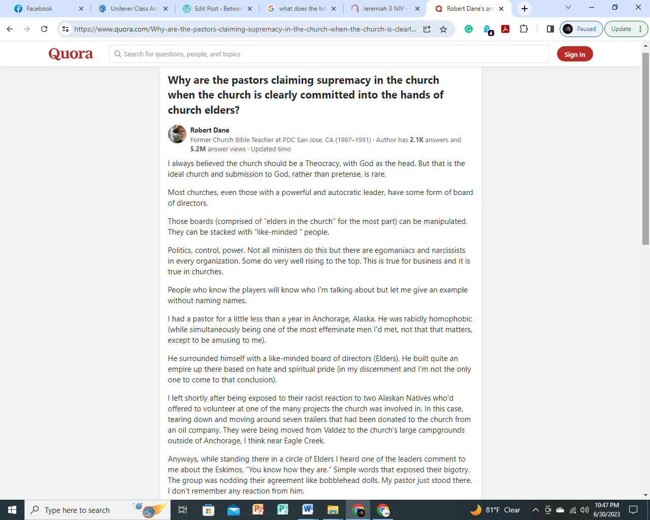 Reading what Jeremiah wrote, we also see that Judah followed suit in what Israel did. Its just a big mess that has filtered down to today. Have you ever found yourself wondering why there are so many denominations and churches today? Have you ever found yourself wondering how does God feel about it?