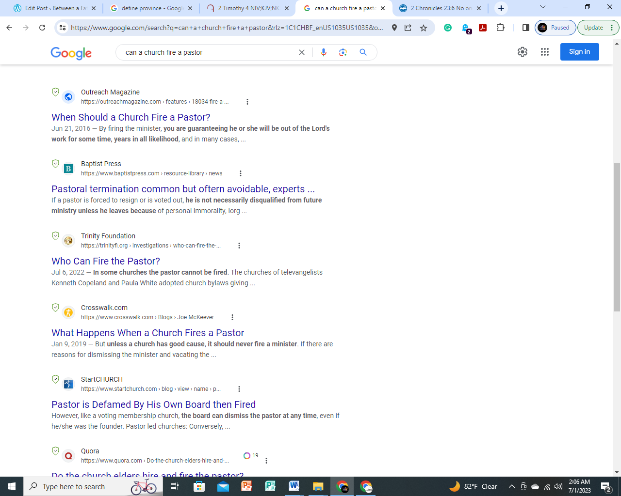 I asked Google: “Can the Church fire the Pastor?” This was new to me after hearing pastors talk about “their church”, although I knew that the church belongs to King Jesus. I just never questioned it. So to find out that if a church does not like the pastor they can have the pastor removed…
